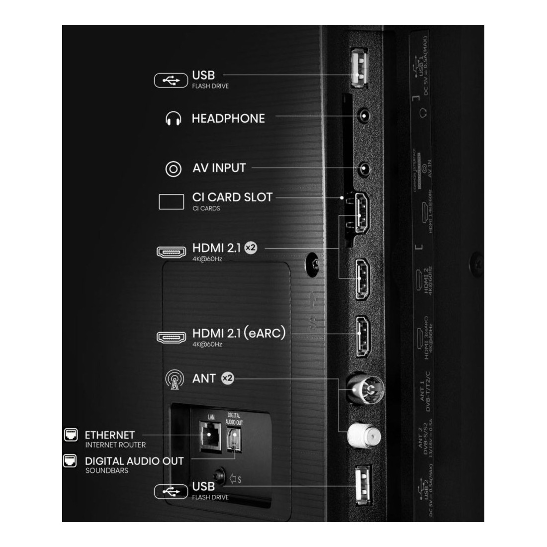 Su diseño plano y elegante encaja perfectamente en cualquier salón. Incluye 3 puertos HDMI 2.1, 2 USB 2.0, entrada de vídeo compuesto, salida de auriculares, Ethernet, WiFi y Bluetooth 5.0. Todo pensado para que conectes lo que necesites sin complicaciones.