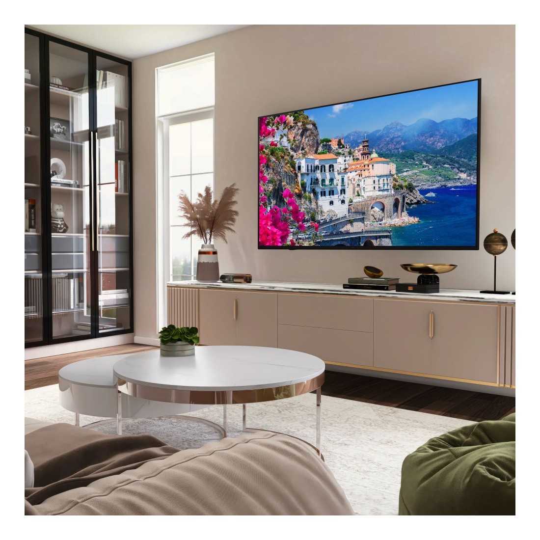 Su diseño elegante y sin bordes visibles permite que la imagen sea la protagonista. El acabado en color negro aporta sobriedad y estilo, mientras que el soporte de patas ofrece estabilidad sin sacrificar estética. Además, es compatible con montaje VESA 300 x 300 mm para instalación en pared.