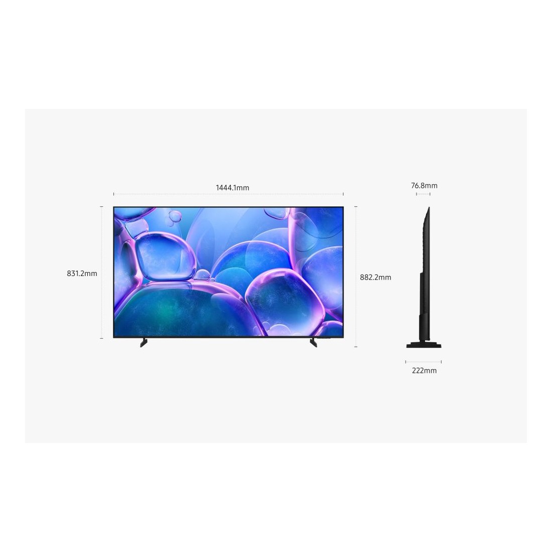 Con soporte: ancho 1444,1 mm, alto 882,2 mm, profundidad 222 mm. Sin soporte: ancho 1444,1 mm, alto 831,2 mm, profundidad 76,8 mm. Peso sin base: 14,2 kg.