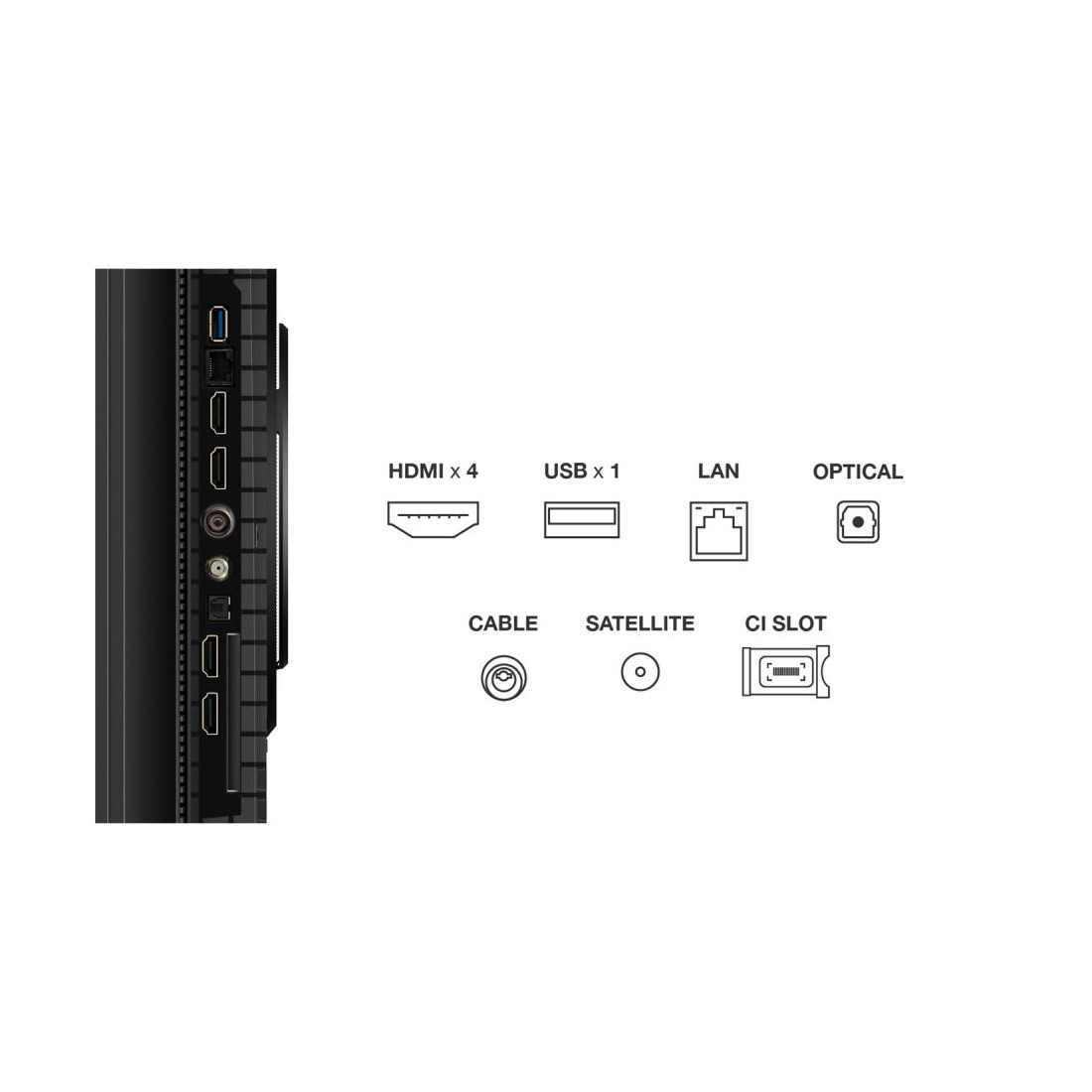 Este televisor presenta un diseño sin marco con acabado metálico, combinando elegancia y modernidad. Su estructura está construida con materiales resistentes como ABS, acero y policarbonato, lo que garantiza una gran durabilidad. Además, incluye una base de patas robusta que brinda estabilidad y estilo.