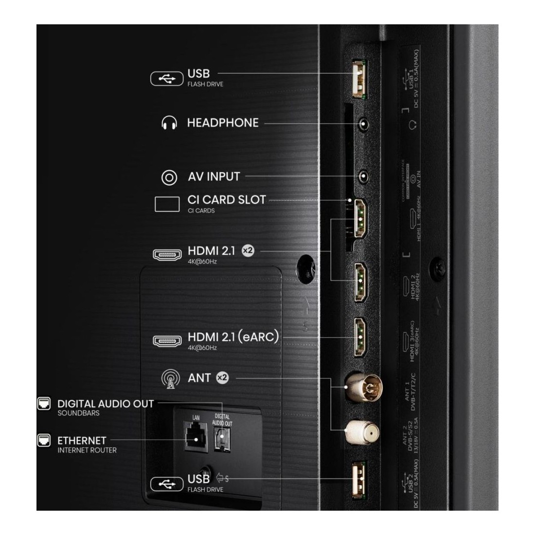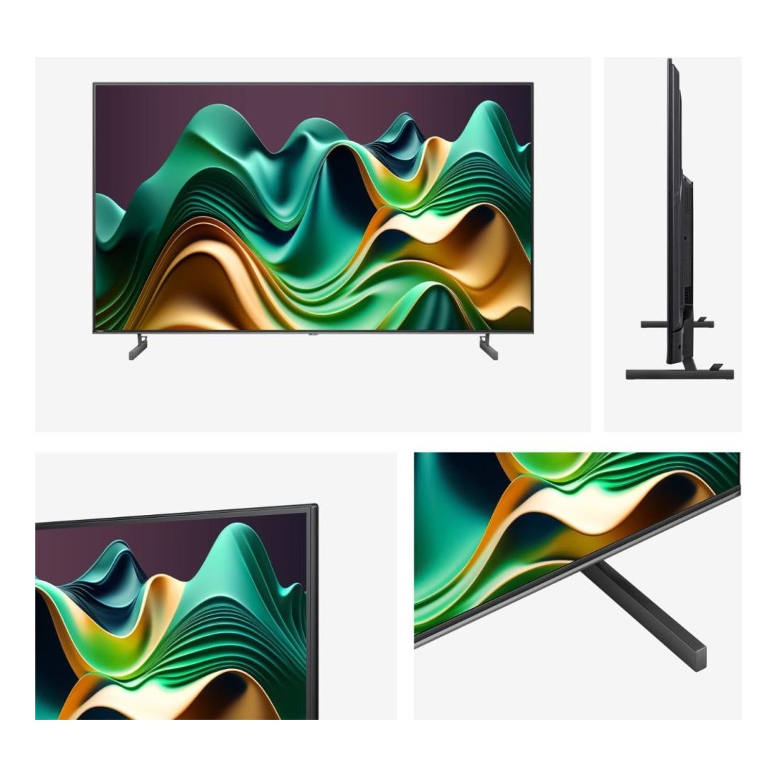 El acabado en gris oscuro y su base metálica aportan un toque moderno y sofisticado. Su diseño plano se adapta perfectamente a cualquier salón, y si prefieres colgarlo en la pared, es compatible con montaje VESA. El material de la carcasa combina aluminio, metal y plástico, ofreciendo resistencia y ligereza al mismo tiempo.